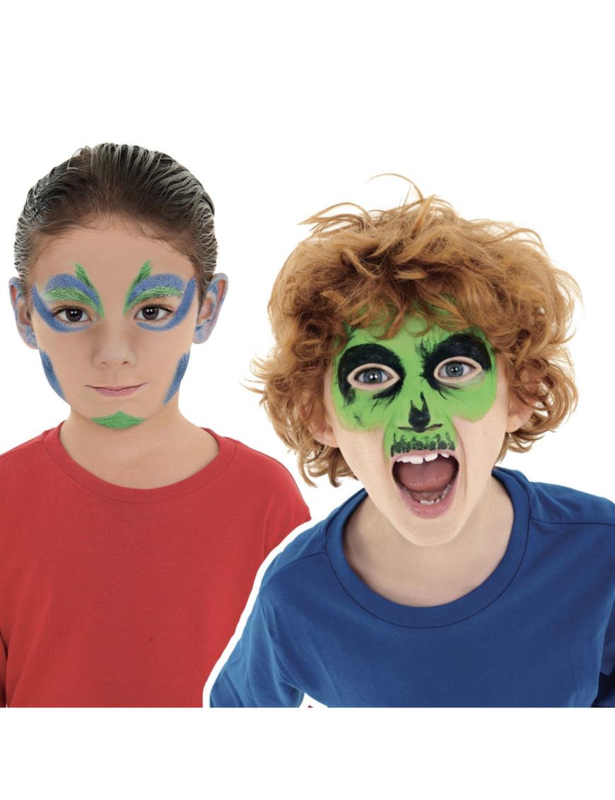 Colores brillantes, a base de agua y lavables. Dermatológicamente probado. Colores que se pueden mezclar entre sÃ. Dos tutoriales incluidos en el paquete