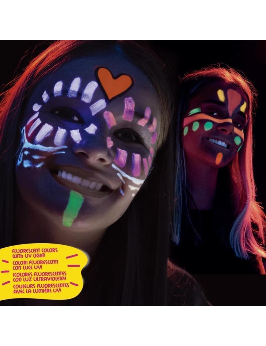 Ideal para fiestas infantiles y de adultos. Colores fluorescentes con luz ultravioleta. Colores mezclables, cubrientes y lavables. 2 Tutoriales incluidos en el paquete