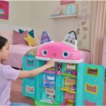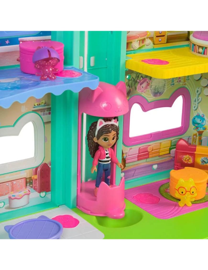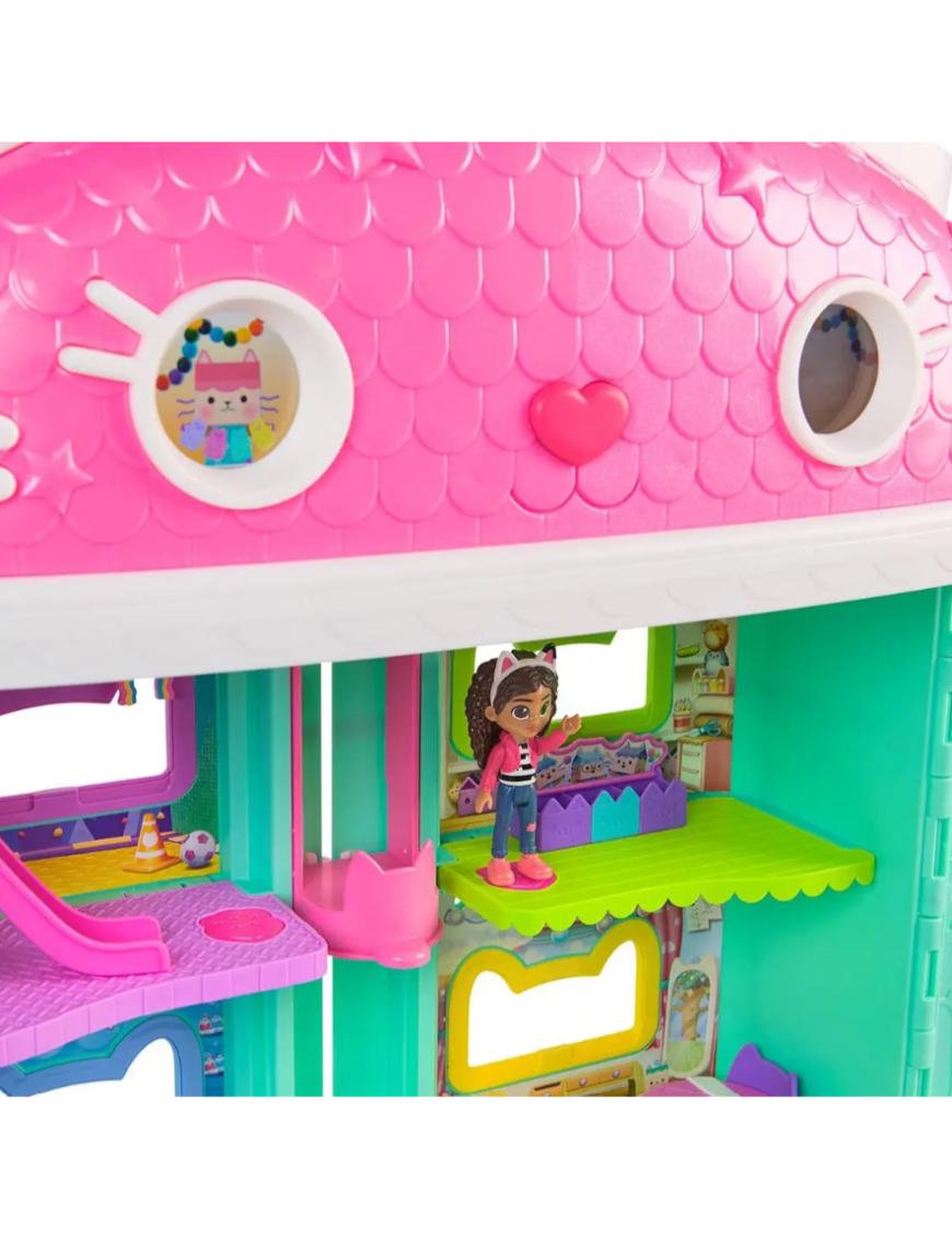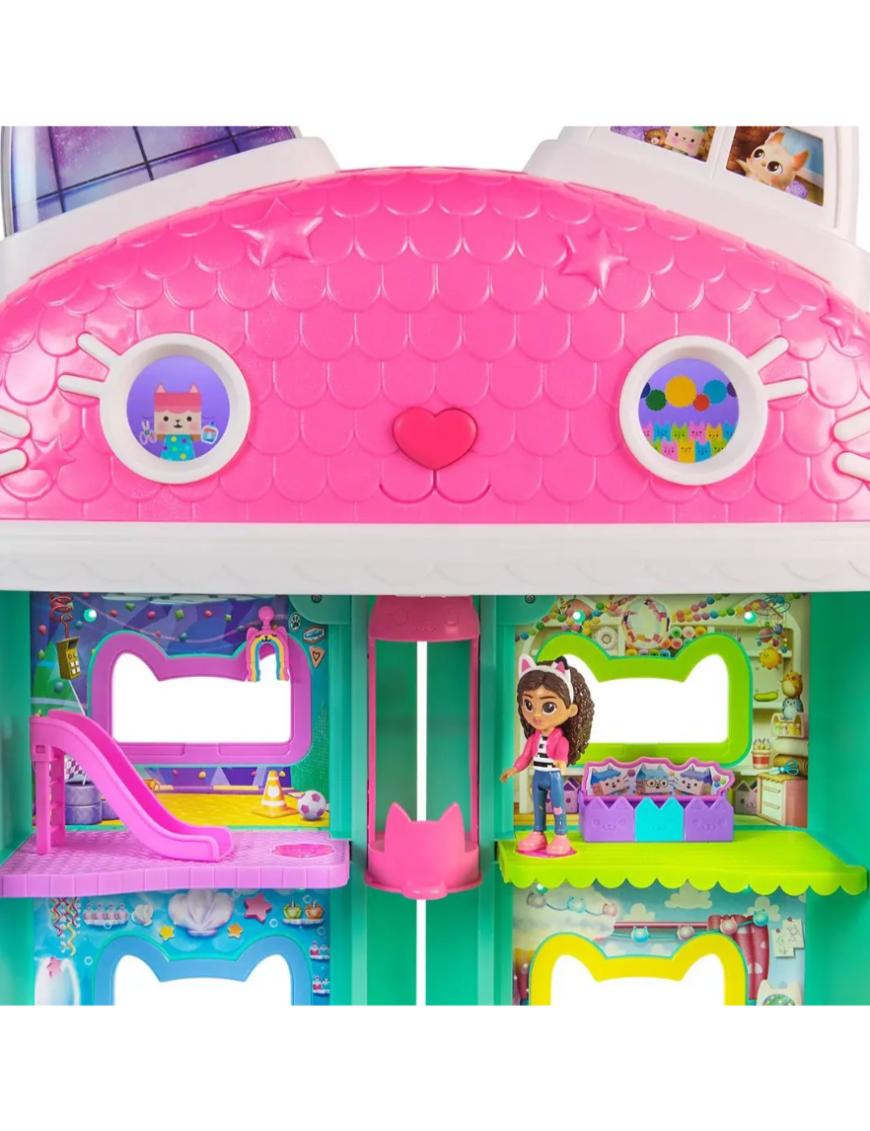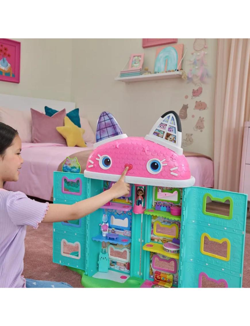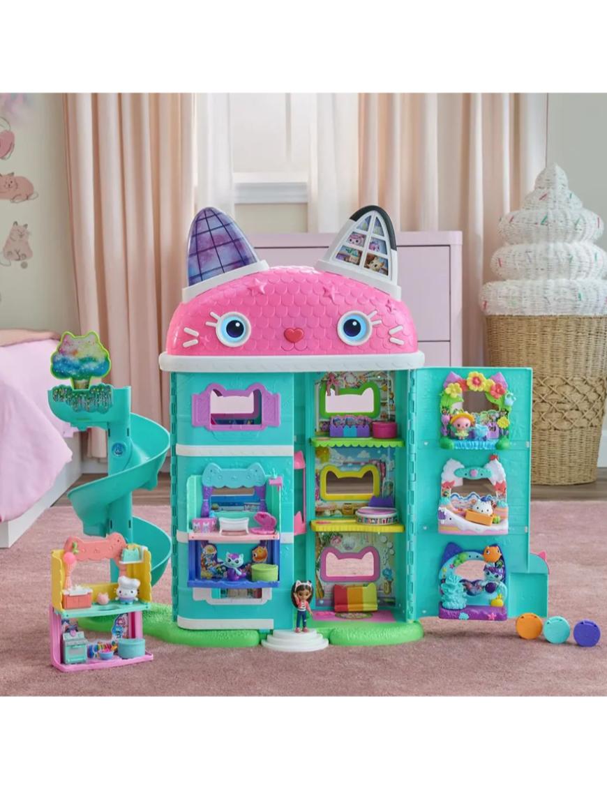 Es una casa interactiva de más de 60 cm de alto que incluye 7 habitaciones con funciones electrónicas, ojos animados en pantalla LCD, un Cat-a-vator funcional y un tobogán espiral para entregas mágicas. Con más de 60 animaciones, efectos de sonido de la película y 6 modos de juego —incluyendo “Cat of the Day” y “Find It”— esta casita invita a horas de juego imaginativo. Incluye Sonidos y efectos vistos en la película. Botones “Paw Bump Magic” y activaciones especiales al presionar la “nariz” de la casita.