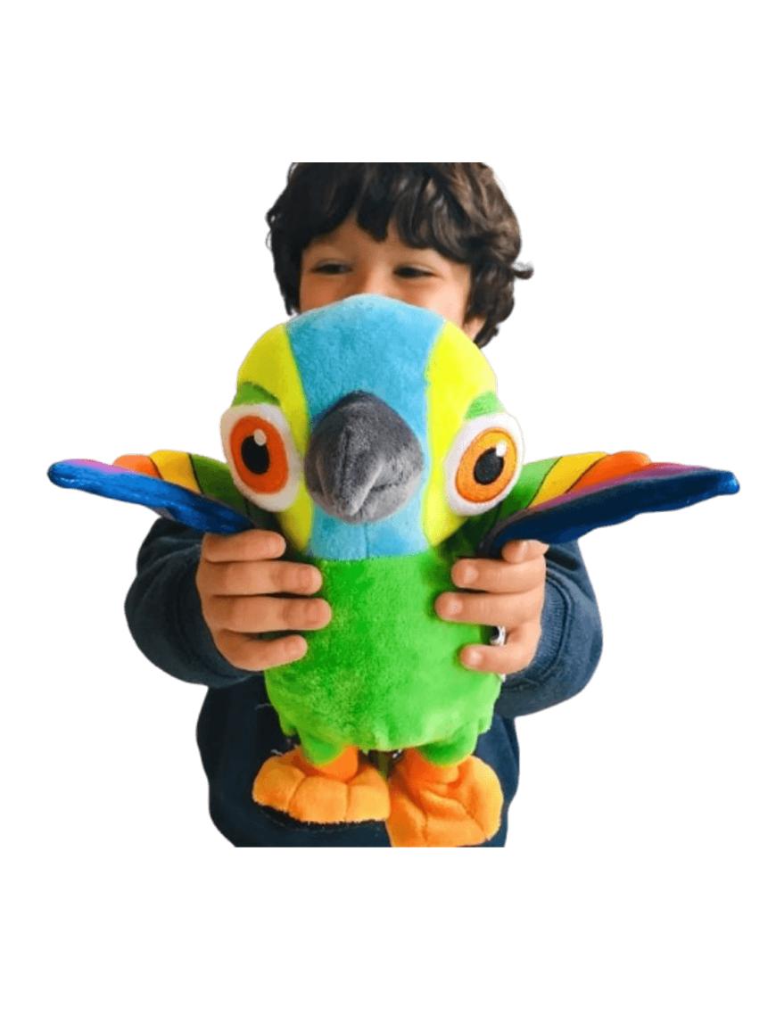 Canta, camina y repite tu voz. Aprieta su alita y comenzará a cantar y bailar las canciones de la serie: El lorito Pepe, El auto bochinchero y La granja de Zenon.