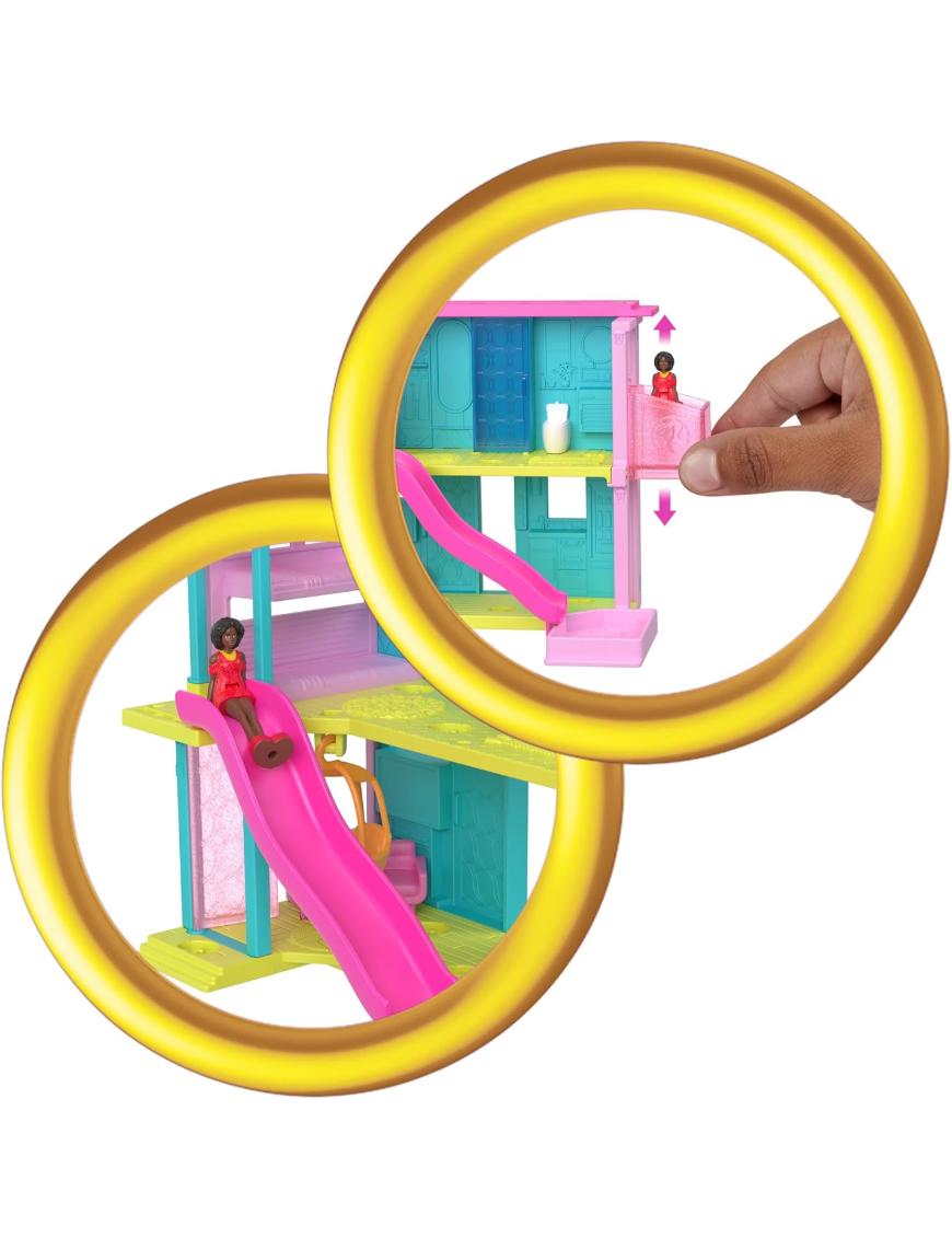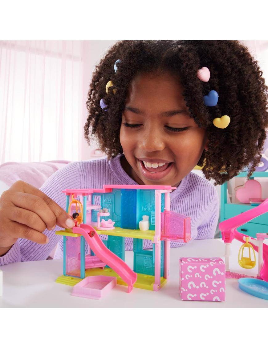 Entra al mundo de Barbie con Mini BarbieLand, ¡un lugar mini para imaginar y soñar en grande! Esta minicasa de muñecas está lista para que juegues con ella o para exhibirla en una hermosa colección. La recreación a pequeña escala de la Casa de Barbie, incluye una minimuñeca Barbie, su mascota, un accesorio para mascotas y, por supuesto, ¡un elevador, un tobogán y una alberca! Las muñecas articuladas se sostienen sobre una base en forma de corazón que encaja en las distintas zonas de la casa.
