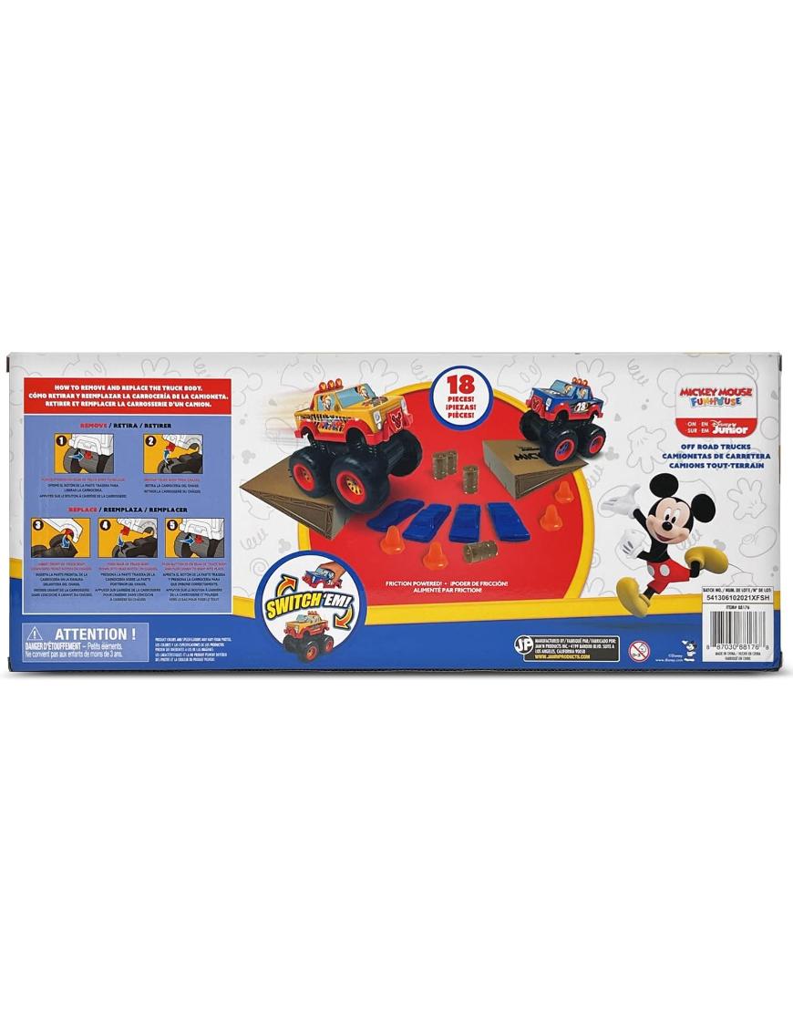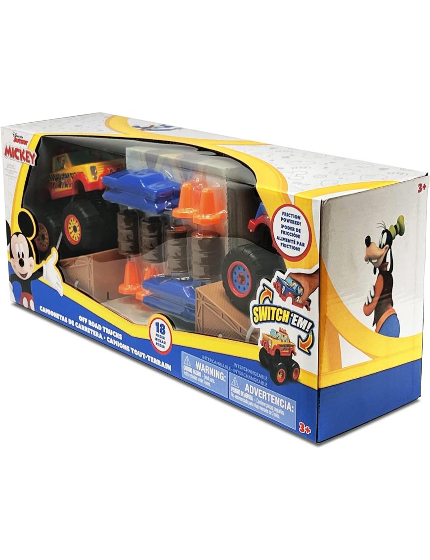 Con 2 Monster Trucks de Mickey impulsados por fricción, los niños pueden crear sus propias aventuras. Conduce a través de los conos y barriles, salta la rampa o simplemente corre por el piso. Con los vehÃculos Switch ‘Ems, los niños pueden quitar el cuerpo del camión del chasis y cambiarlo a otro chasis para mezclar y combinar los colores del camión.