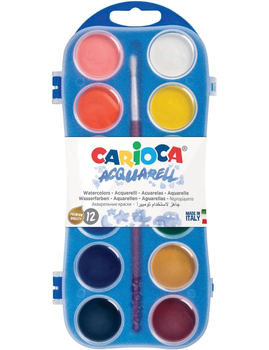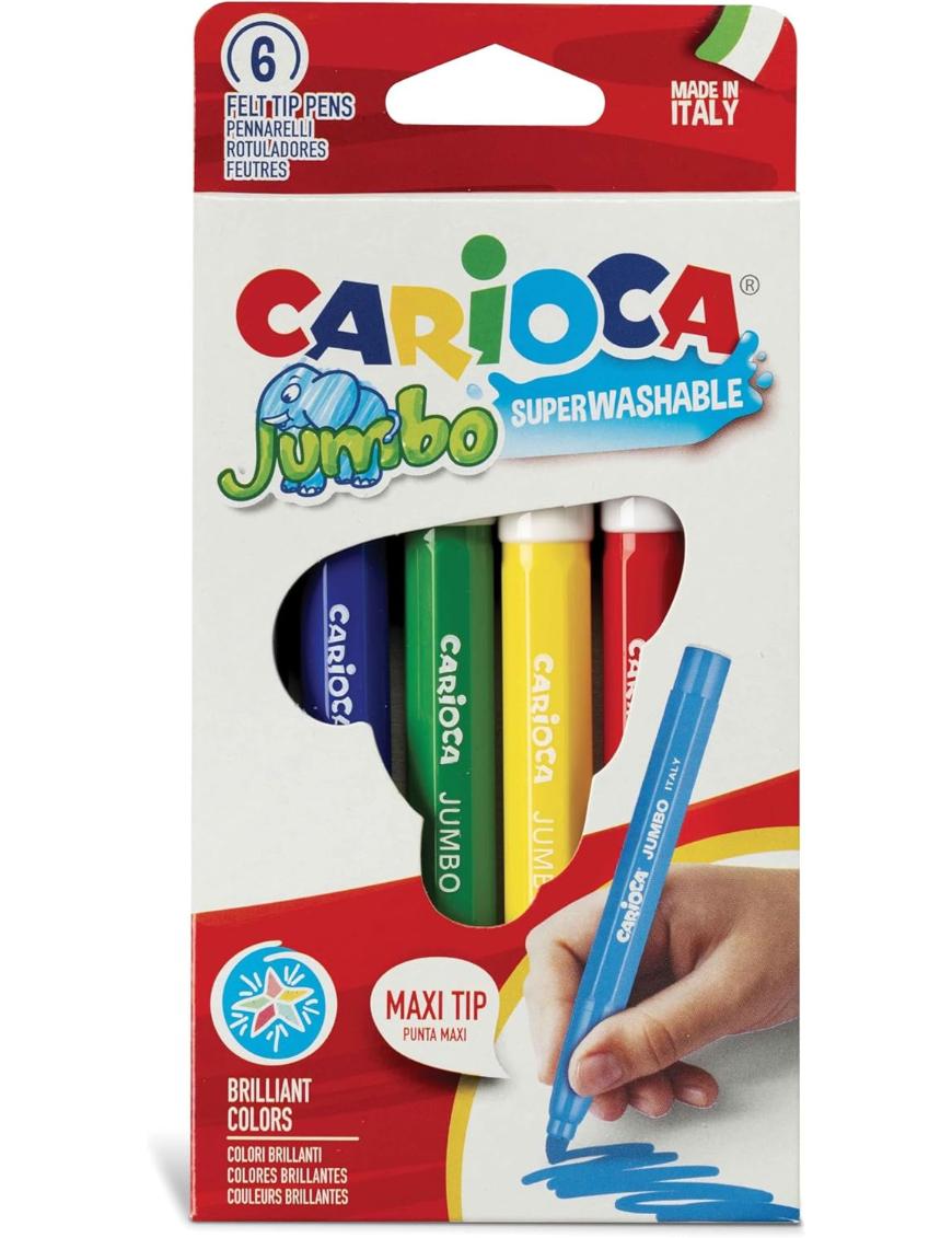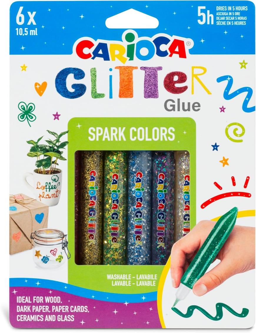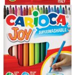 Maleta de papel con asa. Incluye: 18 lápices de colores, 6 marcadores maxi Jumbo, 24 marcadores de punta fina Joy, 24 crayones, 12 acuarelas y 6 pegamentos con glitter